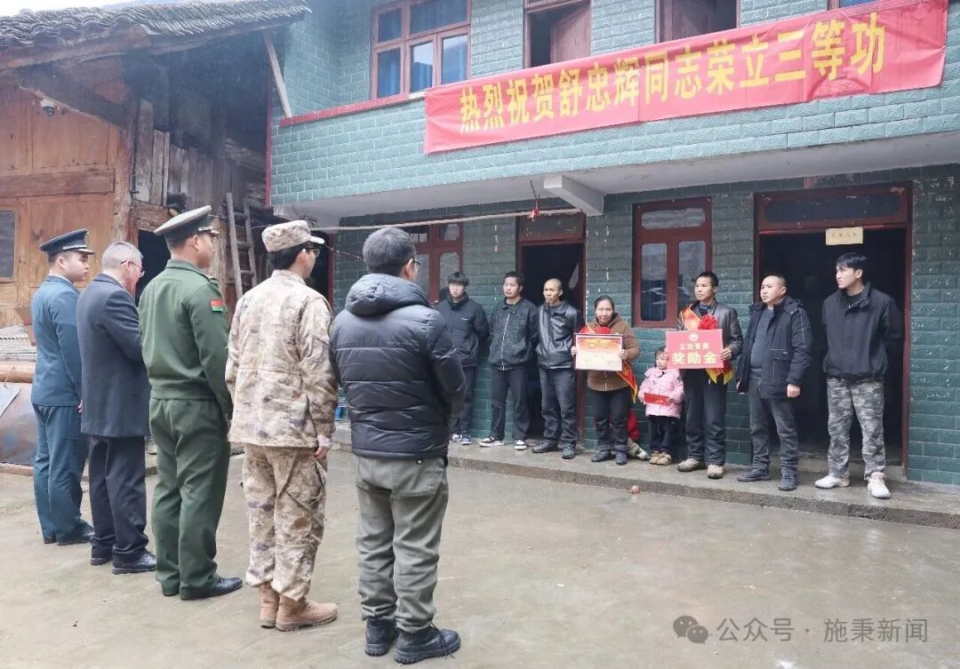 2月10日,施秉县双井镇舒忠辉家门前锣鼓喧天,军地联合送喜报队伍的到来让这个小院瞬间沸腾。县人民武装部与县退役军人事务局送喜报队为舒忠辉父母披上“功臣之家”的绶带,戴上大红花,并送上立功喜报与奖励金。舒忠辉的父亲舒秀平颤抖着双手接过喜报,泪水在眼眶中打转:“孩子能在部队建功立业,是我们全家最大的光荣!”周围亲友纷纷鼓掌欢呼,“舒家出了个好儿郎”。