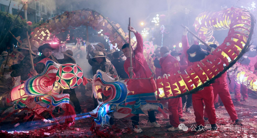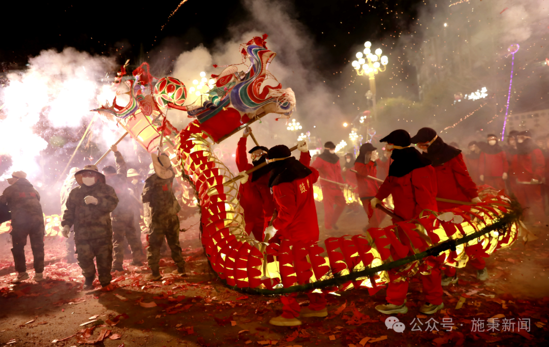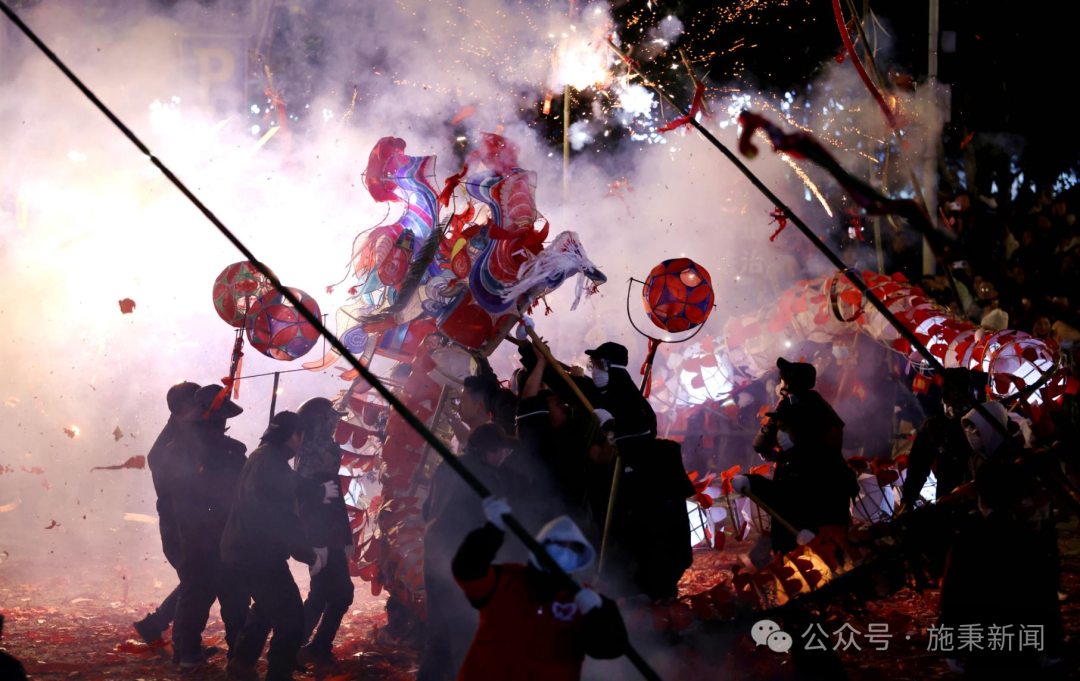 刹那间,火光四溅、硝烟弥漫,鞭炮声震耳欲聋。舞龙小伙子们在“枪林弹雨”中毫无惧色,反倒舞动得愈发狂野,长龙在烟火中翻腾穿梭,时而昂首如飞,时而低回探海,围观群众的欢呼声、呐喊声一浪高过一浪。六百年间,金戈铁马化作锣鼓喧天,边陲卫所成了水墨云山,但施秉人刻在骨子里的忠勇与豪爽,各族人民同心同德、亲如一家的深厚情谊,却在龙灯的腾跃中从未改变。