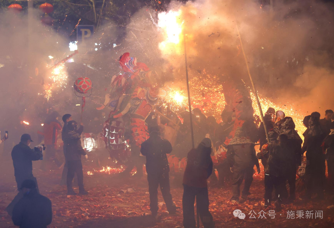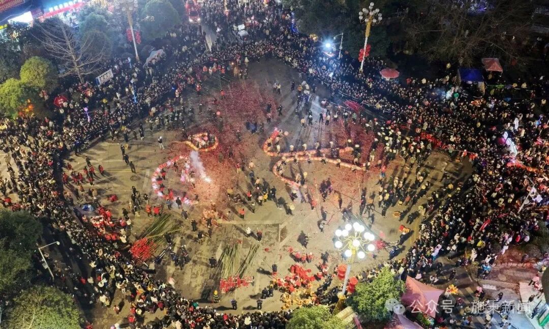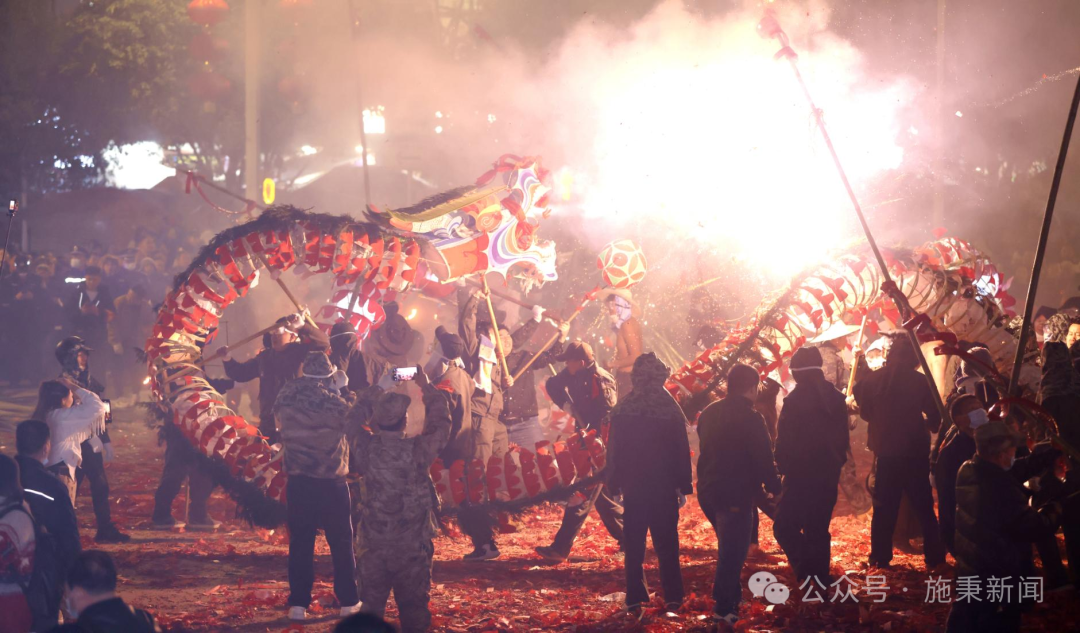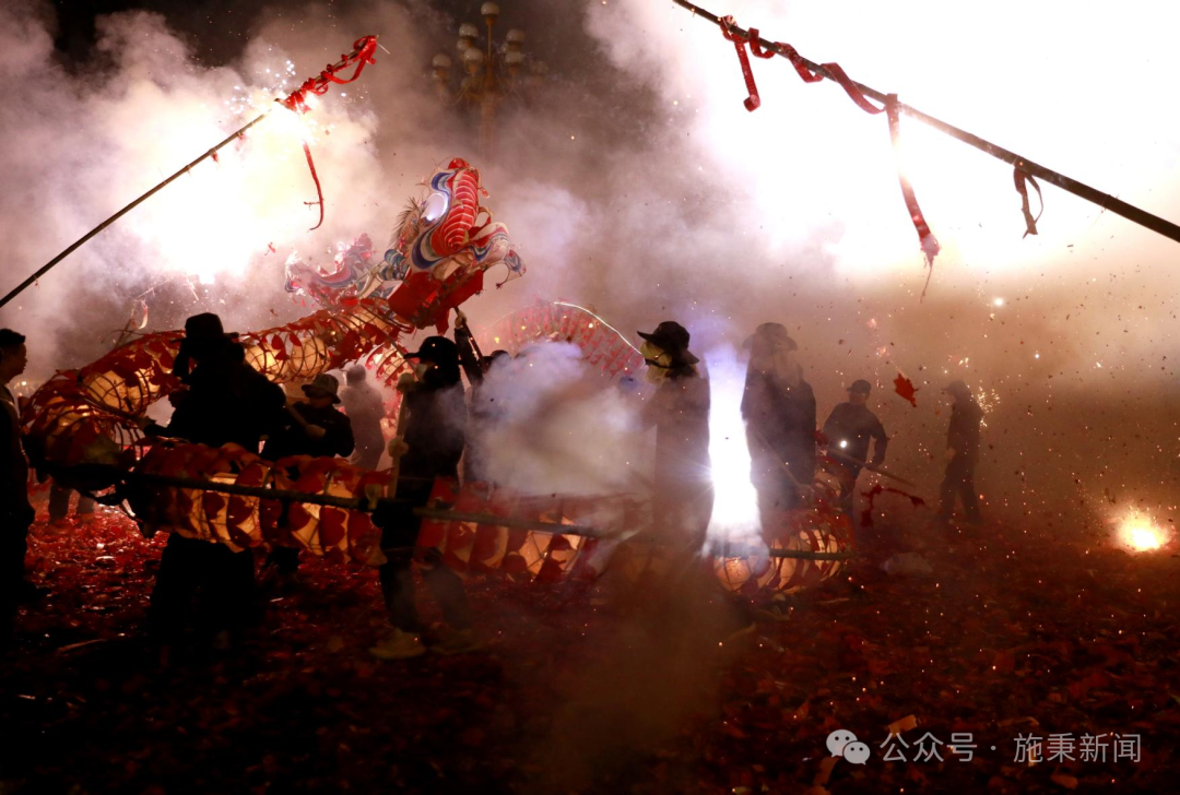 夜幕下的施秉灯火辉煌,人声鼎沸。在位于施秉县城花园的炸龙点,挤满了前来观看和参与炸龙的人群,他们手持绑满鞭炮的竹竿,眼中闪烁着兴奋与期待的光芒,提前为炸龙做好了充分的准备。“炸龙”民俗在岁月中代代传承,融进了施秉人的血脉,成为苗族、汉族等各族群众共同的文化记忆。