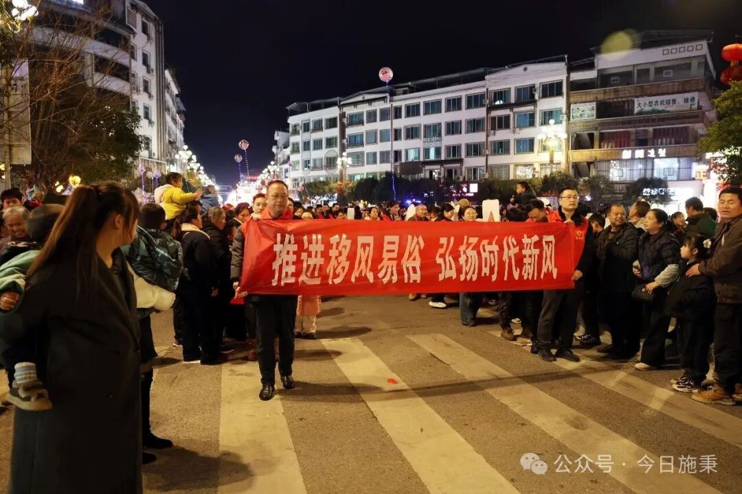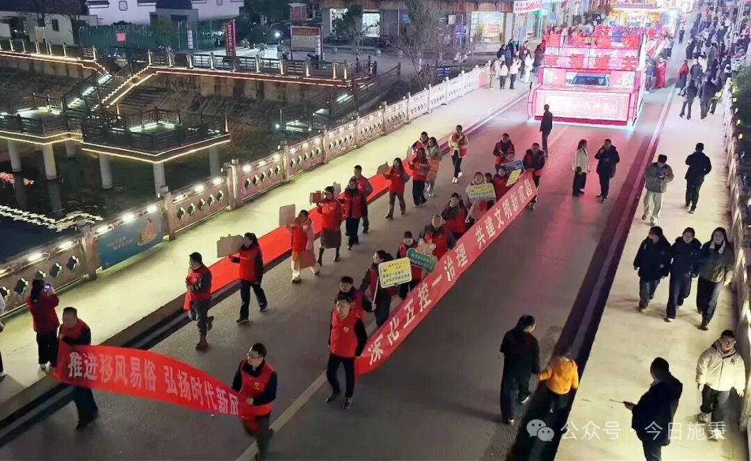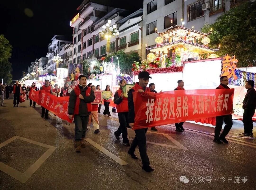 夜幕降临,花车巡游队伍缓缓前行,五彩斑斓的花灯映照着人们欢快的笑脸。在这条流动的风景线上,党员志愿者组成的宣传方队格外引人注目。他们高举“移风易俗”“文明城市”等宣传牌,边走边向围观群众发放倡议书,用接地气的语言讲解文明过节、健康生活的新理念,把新风尚“搬”上了花灯巡游的舞台。