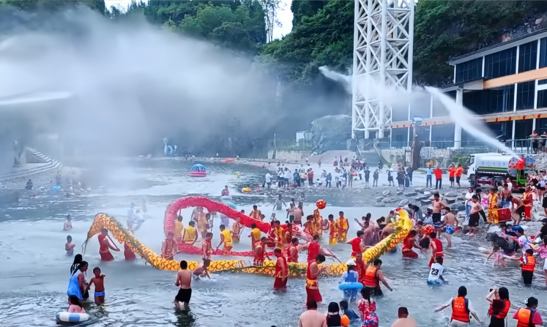 玻璃悬廊喷泉+高压水枪齐上阵,16:30水龙到场时,气氛直接飙到沸点!漂流8兄弟现场带节奏,还有30人氛围组分成4支“战队”(施秉县代表队、县外州内代表队、省内州外代表队、省外兄弟代表队),举着队旗互泼互乐。水瓢、水枪已备好,就等你加入这场“湿身派对”!