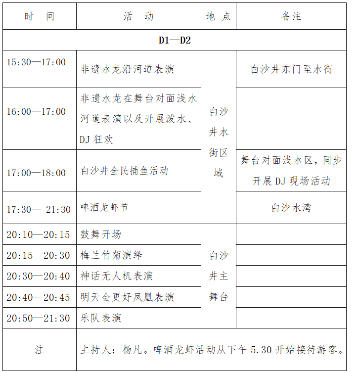 15:30从东门出发,沿河道巡游1小时,16:30抵达水街舞台前浅水区,在声光特效中演绎“双龙出海”“龙腾盛世”。