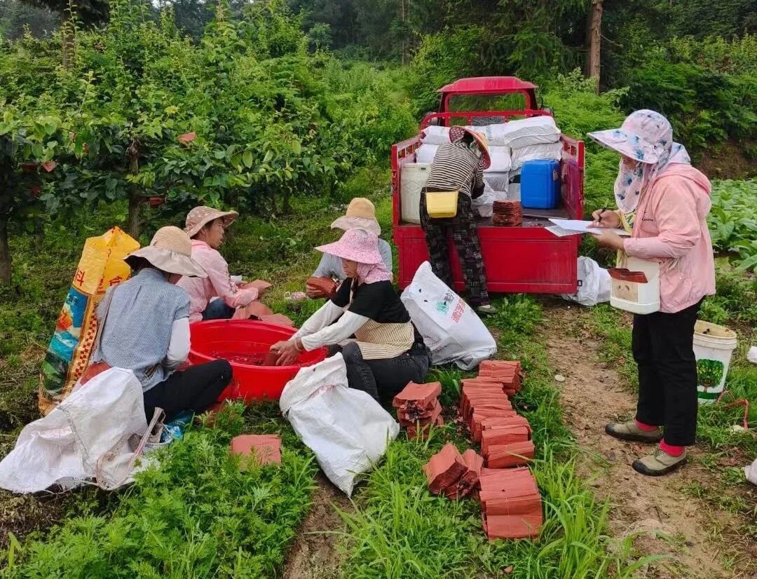 “现阶段的管护对水果的品质和产量至关重要。” 基地负责人龙春羽介绍,“疏果能保证果实养分供应充足,让果子长得更大更甜。而套袋则能有效降低农药残留、防止病虫害,还能提升果色品质。” 同时,不少村民通过在果园务工、土地流转以及入股分红等方式,实现了收入的多元化。“在果园务工,一天能有120元左右的收入,既照顾家庭,又可以增加收入,生活充满幸福感。”正在果园务工的陈大姐喜滋滋地说道。据悉,龙春羽水果种植基地黄金梨约400亩,珍珠油桃230亩,日均吸纳15名工人作业,日均工资达120元。