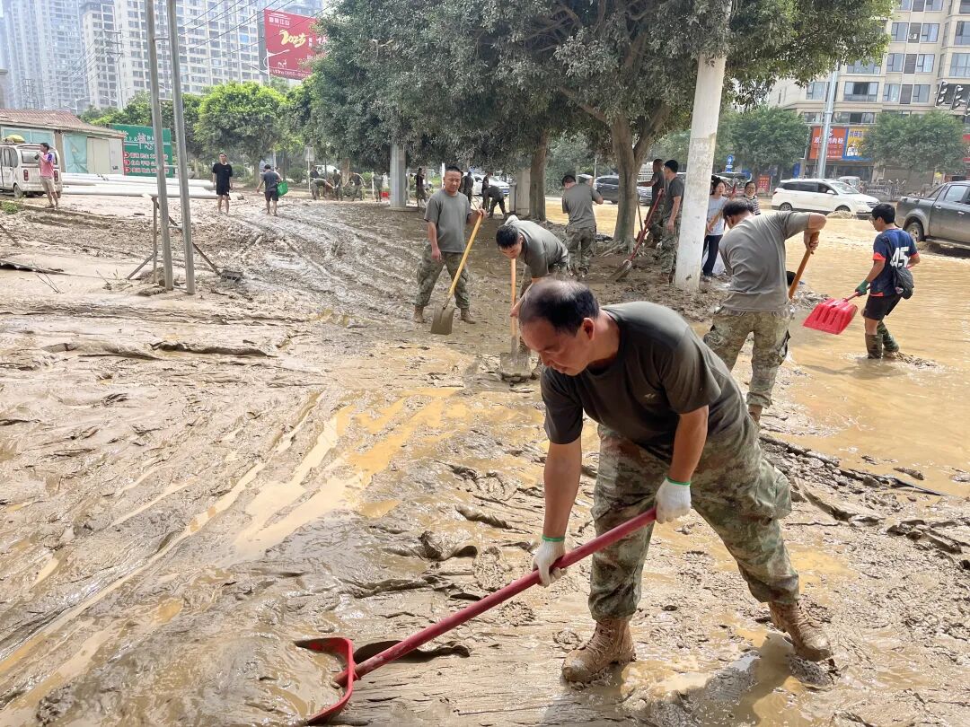 洪水虽已退去,但厚厚的淤泥却让人寸步难行,道路被泥浆层层覆盖,面对繁重的清淤任务,马溪乡基干民兵发扬“不怕苦、不怕累”的战斗精神,手持铁锹对街道、院落堆积的淤泥、垃圾进行全面清理,民兵们一铲一铲地将黏稠的泥浆装车运走,再用高压水枪冲洗路面,铁锹与地面的摩擦声此起彼伏,汗水浸透了每个人的衣背,但没有人停下手中的工具。他们用汗水和行动为受灾群众打通“回家路”。