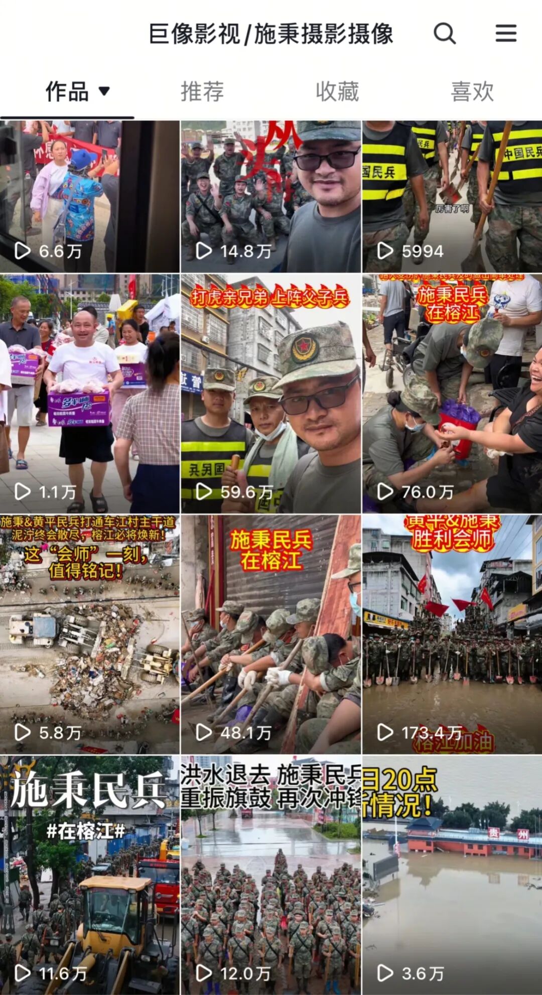 其中值得一提的是,他拍摄的施秉县和黄平县救援队伍顺利“会师”及“父子兵”并肩抗洪救灾的两段视频播放量较高。“会师”视频不仅在他的个人账号上播放量达到169万、评论达5000余条,还通过他的无偿分享被央视及多家媒体使用宣传。“父子兵”视频在他个人账号上的播放量达到58万,评论达4400余条。此外,还有其他多条视频播放量达到几十万,这些作品生动展现了施秉民兵队伍的不畏艰险、吃苦耐劳、攻坚克难的精神,引发了良好的社会反响,获得人民群众认可,激发更多人关注榕江灾区实事和参与支援的热情,传播了满满的社会正能量。