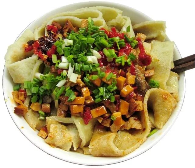 锅巴粉因制作的成品与用锅做饭时蒸出的锅巴颇为相似而得名,绿色健康的锅巴粉皮中间有许多小孔,充分地将汤水和佐料吸入粉内,极为爽口